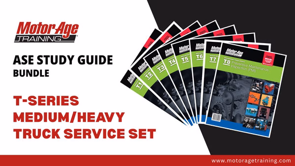 Get the knowledge, skills, and confidence you need to pass all eight ASE T-Series Medium/Heavy Truck Service Certification Exams with Motor Age Training’s comprehensive T1–T8 study materials. Whether you prefer printed books, eBooks, online video courses, DVDs, or digital practice tests, this complete bundle offers flexible study formats to fit your learning style and help you succeed.